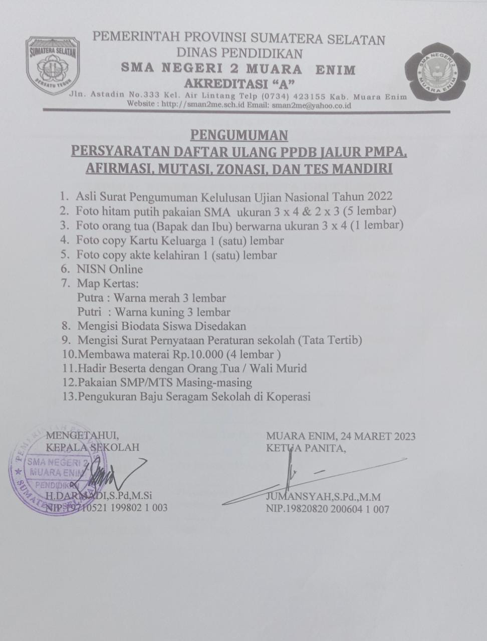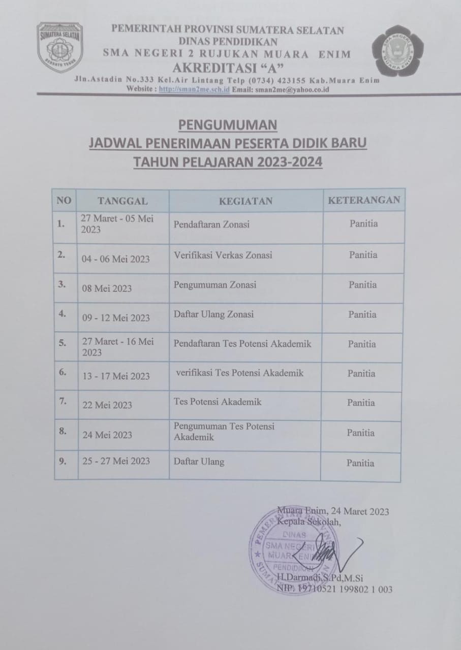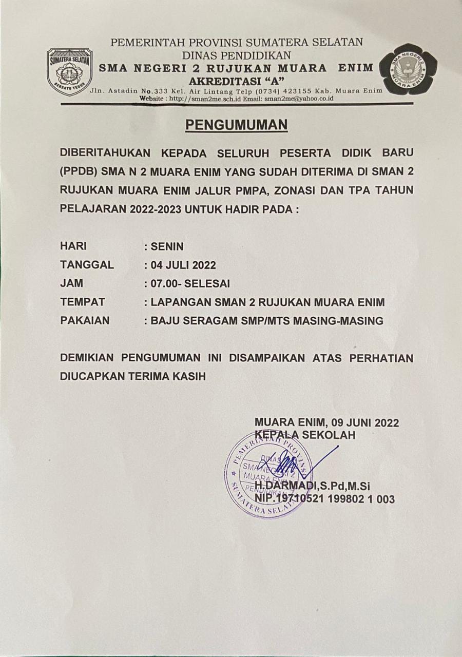 Pengumuman Hasil PPDB dan Persyaratan Daftar Ulang SMAN 2 Muara Enim Tahun Pelajaran 2024/2025